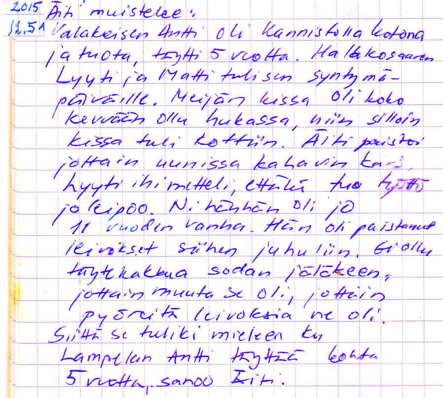 Antti oli 12 vuotta. Maria oli kaupassa töissä Kyyjärvellä. Liisa ei ollut enää sitten tajuissaan. Isä ja Tuomas olivat tukkimetässä. Ronkkelilla tai parireellä toivat tullessaan pari tukkia. Irja sanoi isälle, että ”äiti on huonossa kunnossa”. Isä meni juosten tuppaan. Kello 20 illalla loppui. Samana iltana laitettiin arkkuun ja vietiin saunan lauteille. Ei menny viikkoa enempää, kun haudattiin. Ruokaa laitettiin hautajaisissa. Irja kävi katsomassa äitiä joka päivä saunassa, nosti kannen ja katsoi.