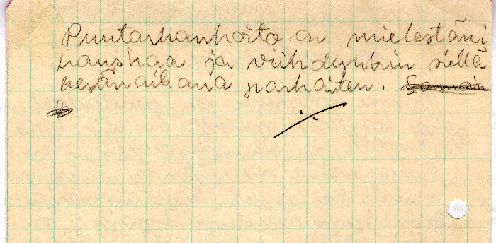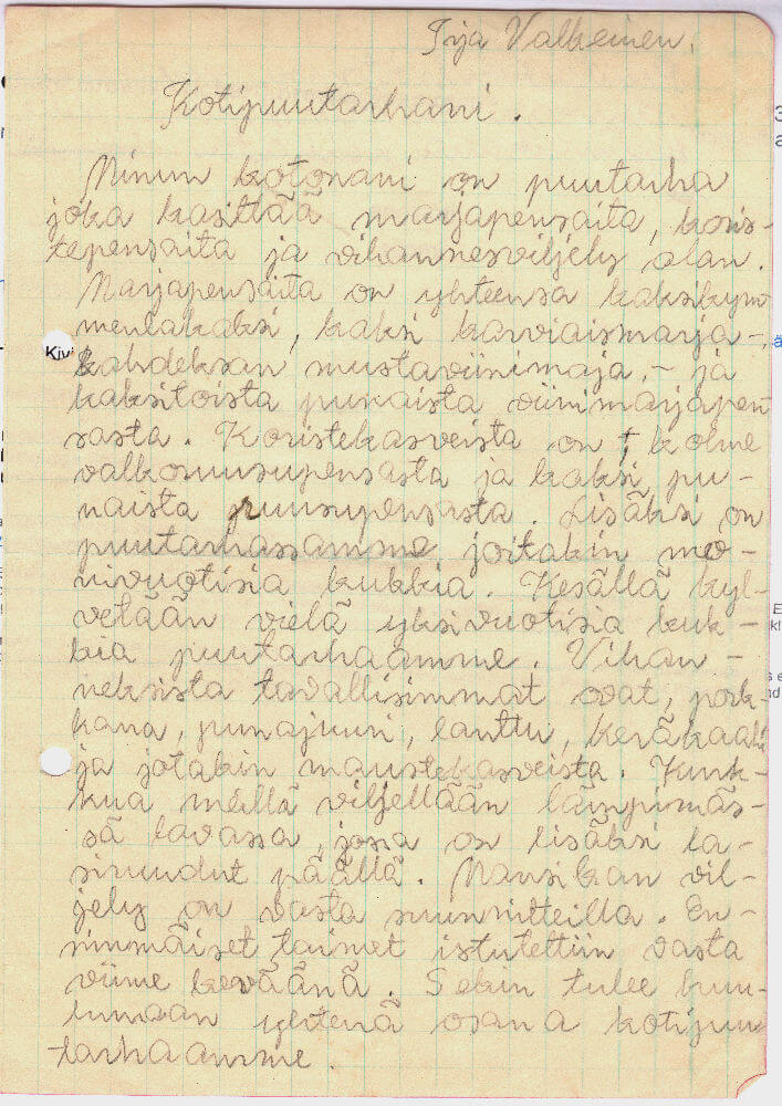 Puutarha oli äidille mieluisa paikka. Tässä äidin aine Emäntäkoulusta vuodelta 1953.