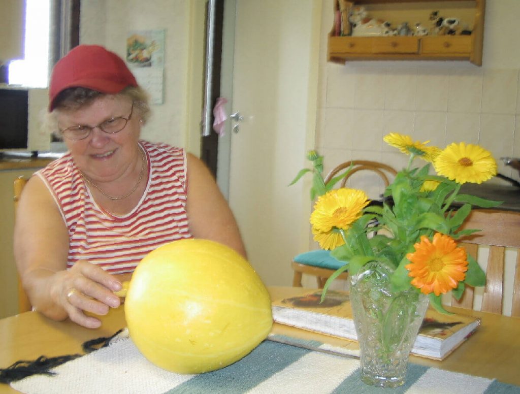 Äiti tykkäsi puutarhuroinnista myös Rantapellolla, ja kaikenlaista tuli kasvatettua. Tuona kuumana kesänä kurpitsoista tuli kasvihuoneessa muhkeita. Äiti oli iloinen ja ylpeä niistä ja keitteli säilykkeitä ja paistoi jos minkäkinlaista piirakkaa.