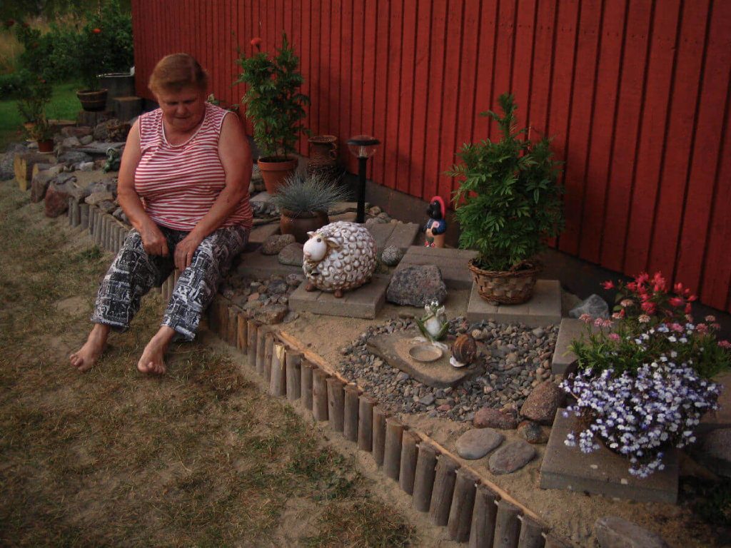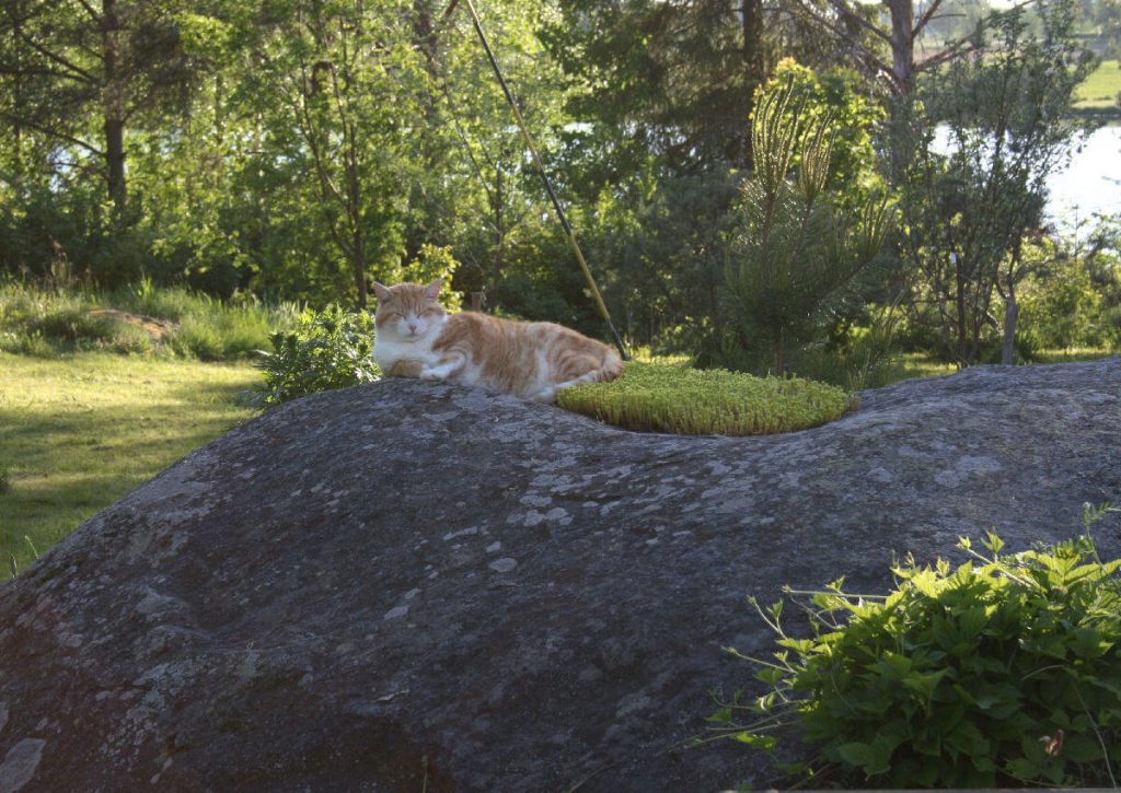 Tuona kuumana kesänä innostuttiin tekemään kivipuutarha talon päätyyn. Ja mukavahan se olikin siihen istahtaa ja kädellä sivellä niitä sileitä kiviä, jotka olivat päivän aikana kuumassa auringon paahteessa lämmenneet.