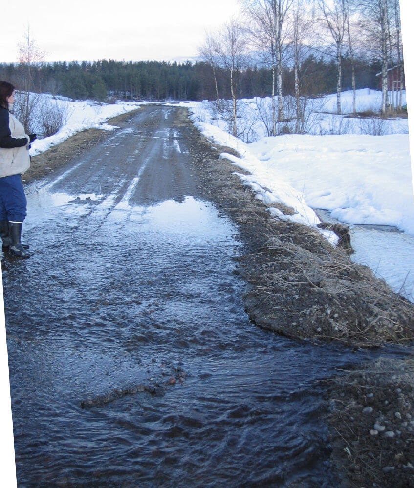 Tulvat olivat jokakeväisiä tuttuja, vuonna 1981 oli suurin tulva miesmuistiin, ja tuosta tulvasta on tuo ylin kuva. Vettä oli heti Kiviahonmäen alta lähtien ja pitkälle Harsuselle päin. Maitotonkat piti viedä veneellä Harsusen puolen tulvan yli maitoautolle. Sitä varten isä osti veneen. Kouluun oli jännittävä mennä tulvien aikaan. Piti ottaa polkupyörällä kauhia vauhti, että pääsi Hallituksentien puron kohalta yli, kun vesi ulottui yli puolen renkaan. Kun vesi virtasi tien yli, se teki tiehen uomia. Se olikin sitten kylmempi paikka, jos rengas meni semmoiseen. Ja vielä pahempi oli se, kun vesi vei rumpujen kohdalta maan ja hiekat pois ja tuli reikiä rummunrenkaiden väleihin. Isä mahtoi hakea kauppatavarat traktorilla, kun vesi oli korkeimmillaan! Jos rumpu oli rikki, niin sitten ei päässyt silläkään.