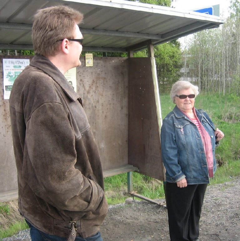 Ulla oli kuskina, auto jätettiin erään talon pihaparkkiin ja äiti siinä niin sirpakkana bussipysäkillä.  Ja miten pieneltä hän tässä näyttää ja aurinkolasit silmillä: Totesin, että ZZ Top se tässä on lähdössä Tallinnaan. Mustat housut ja farkkurotsi päällä ja menoksi. 🙂 Niin ja lippis oli tietysti kans päässä.