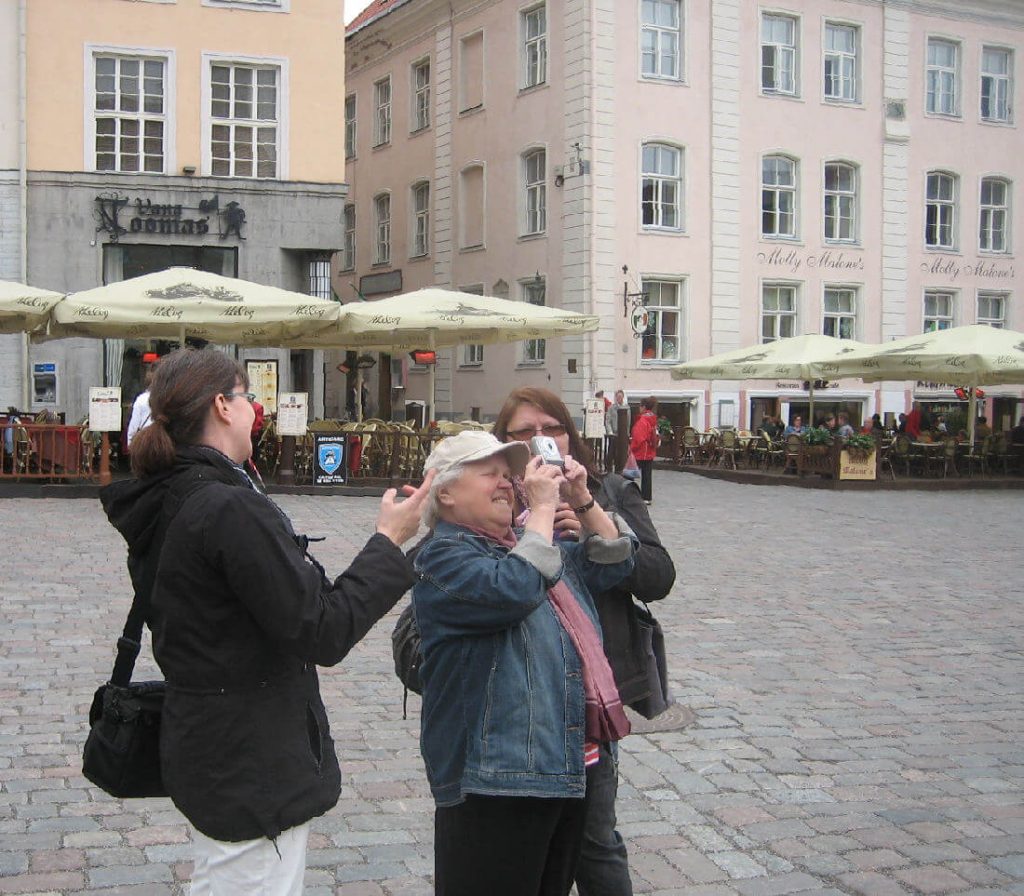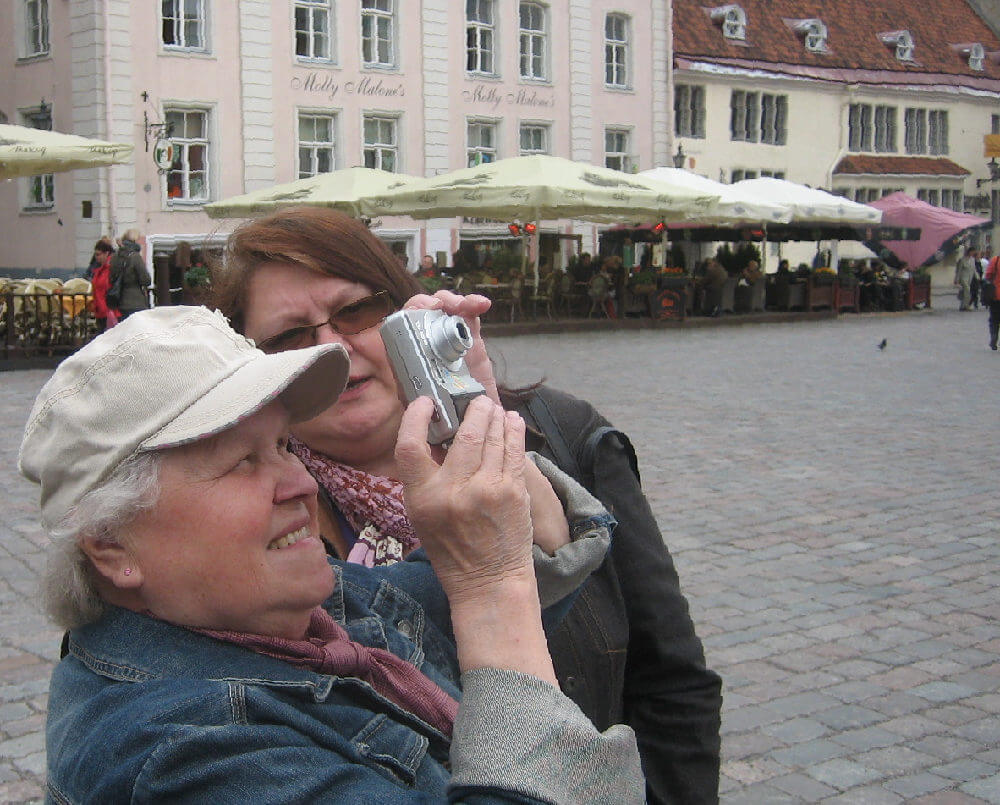 Äitillä oli tietysti oma kamera mukana ja hän olikin mestari, ja päätti että hän ottaa Tallinnassa vanhassa kaupungissa ite valokuvia. Ja otti kans. Siinä vähän sihtailtiin, että miten se talo tai torni siitä aukosta näkyy. Miten sais kaikki nuo Tallinnan talot siihen, sitte klips ja siinä se oli valokuva. Piti sitä meidän kaikkien ihmetellä sitä ruutua, vaikkei nähtykään mitään, ei se niin helppoa ollut.
